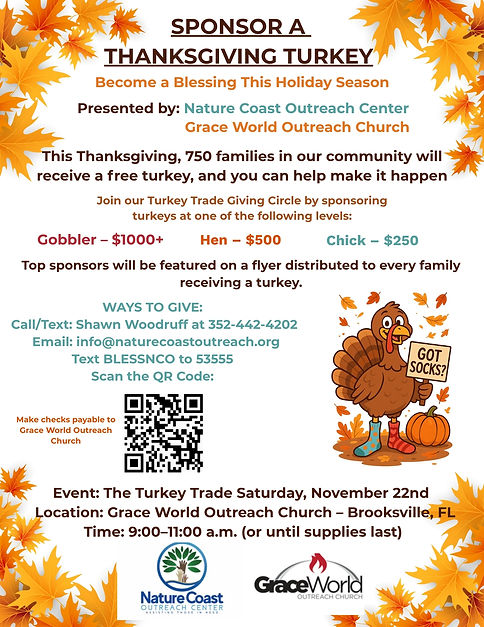 At Nature Coast Outreach Center, our mission is to extend a helping hand to those facing adversity by providing essential resources that alleviate immediate needs. Rooted in the values of faith, hope, love, and compassion, we believe in fostering a community where every individual is valued and supported. We are dedicated to creating impactful change through collaboration, actively partnering with local ministries and organizations to amplify our efforts and reach even more lives.